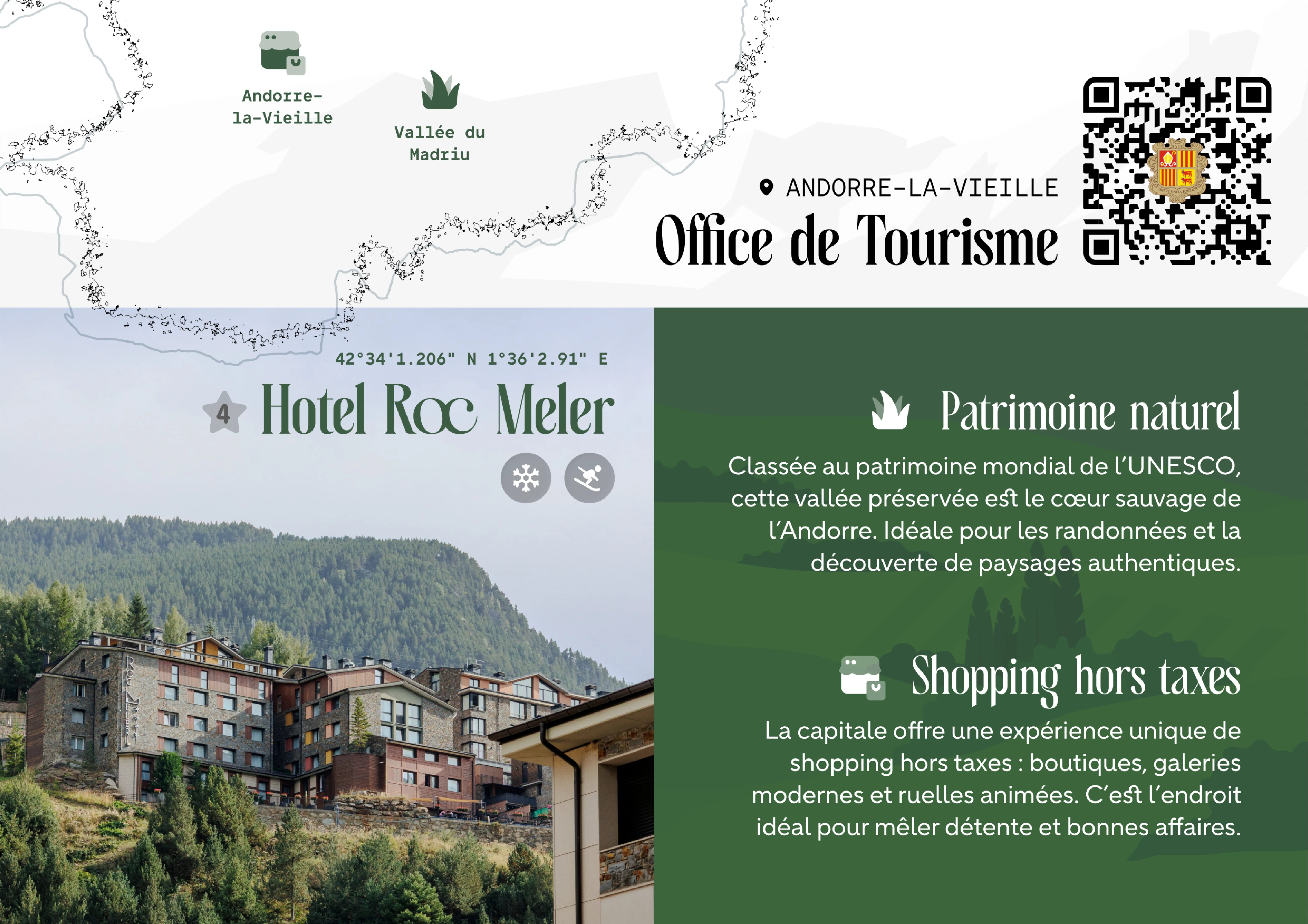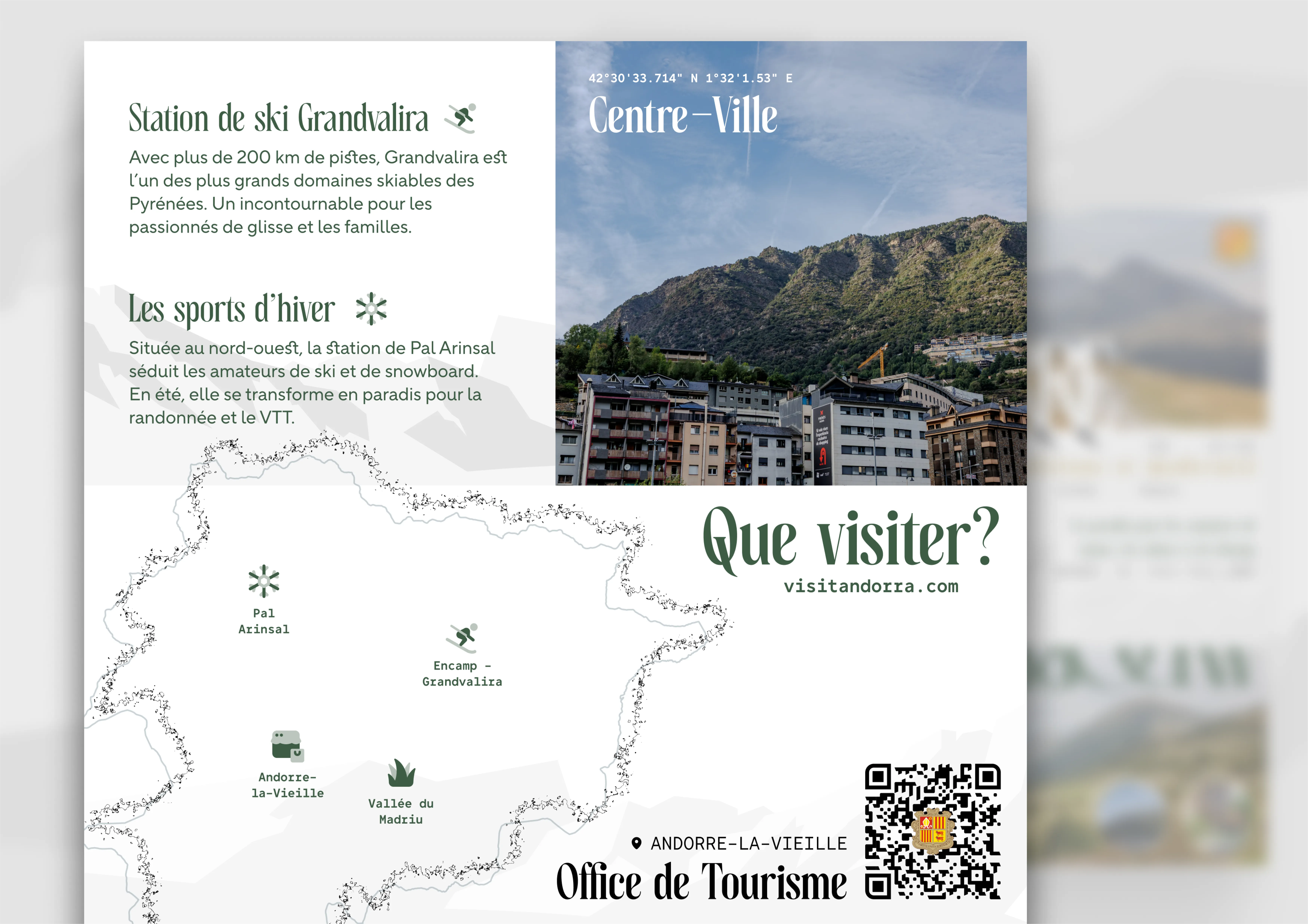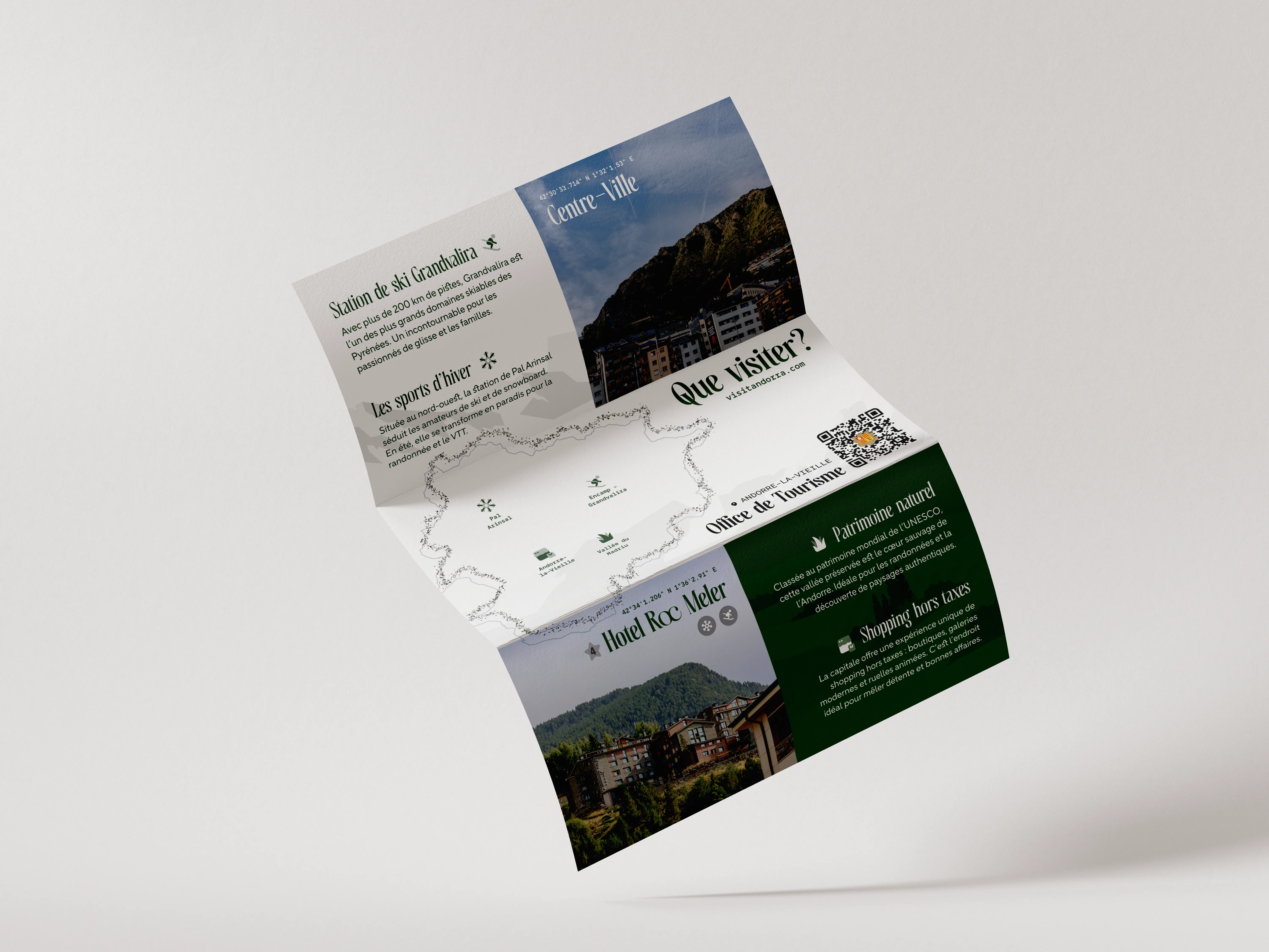 Colour accents were drawn from the natural surroundings of Andorra: forest greens, stone greys, and golden tones. This palette, combined with photographic textures, gives the brochure an identity rooted in the landscapes it promotes.