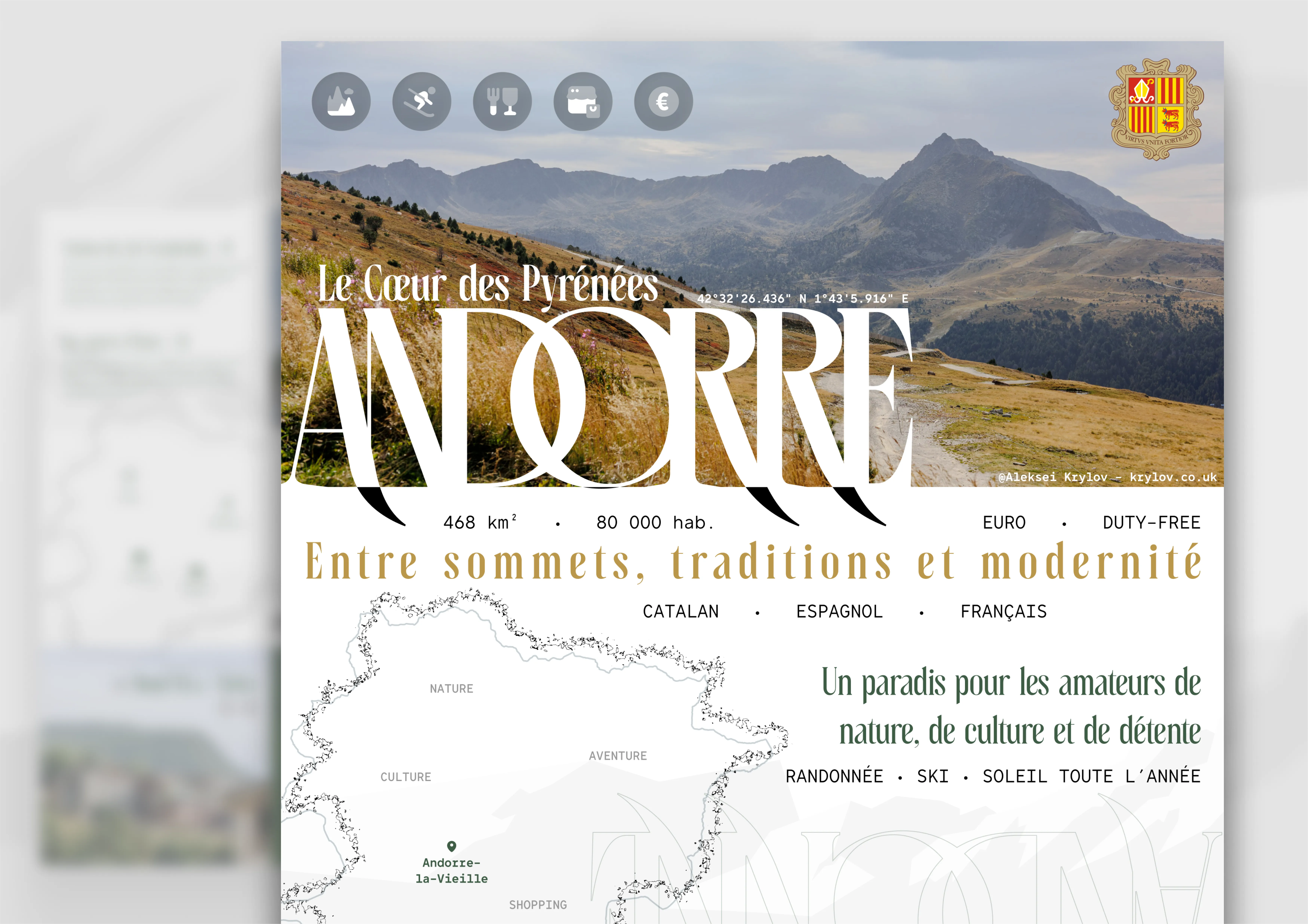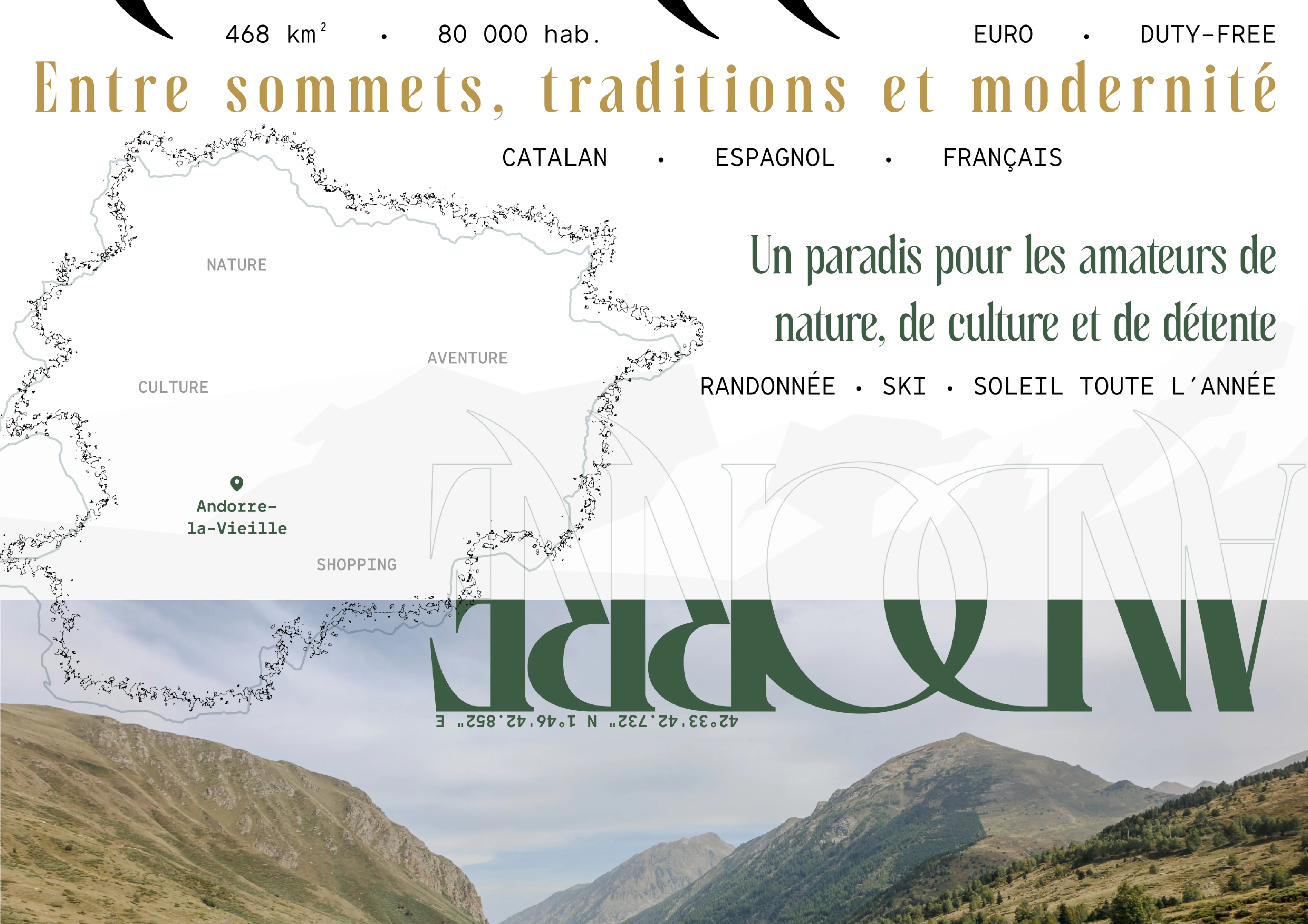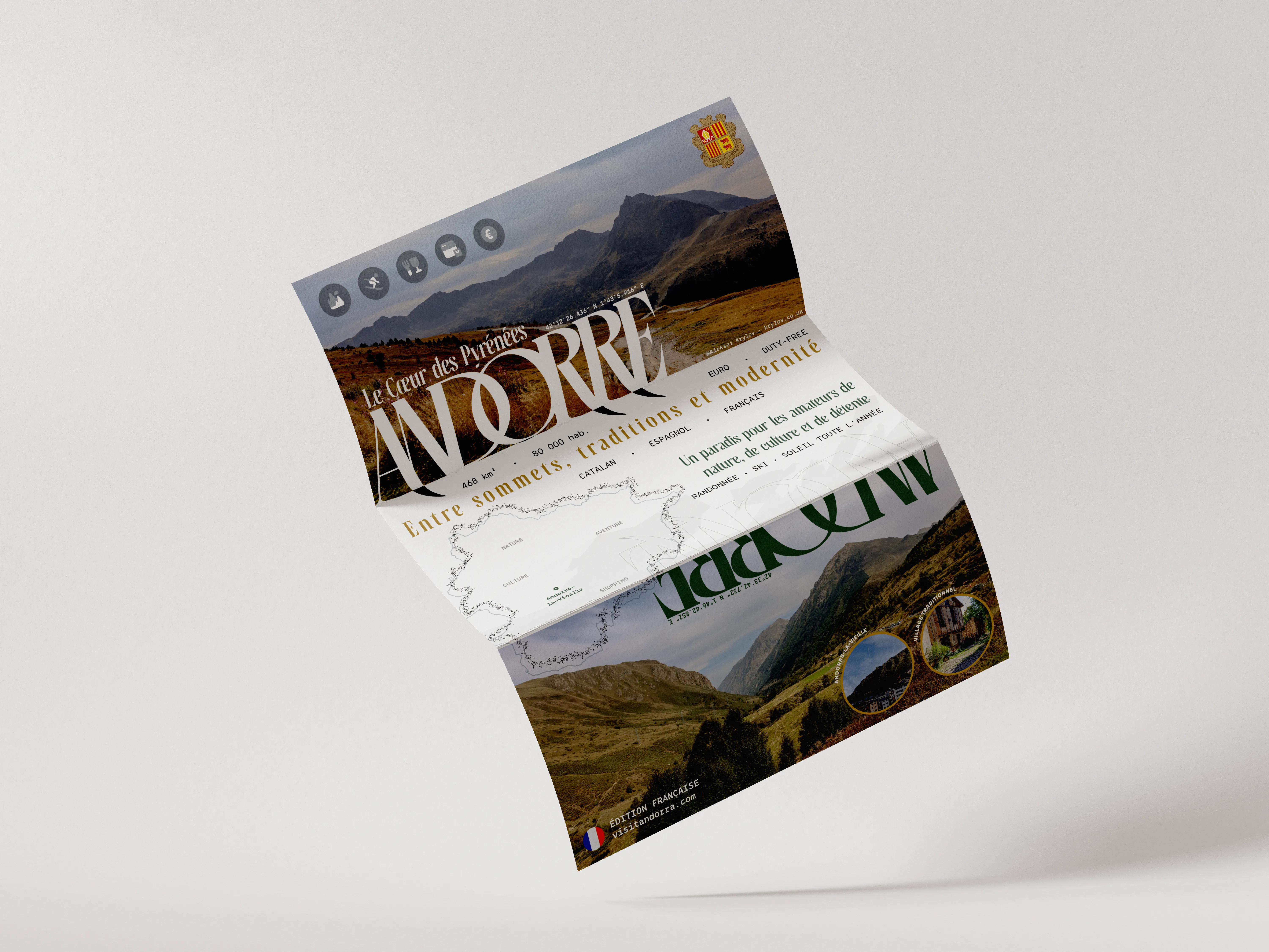 This project focused on building a tourist brochure around Andorra, a mountain country known for its culture, nature, and modernity. The challenge was to merge original photography with clear information design to capture the spirit of a destination.